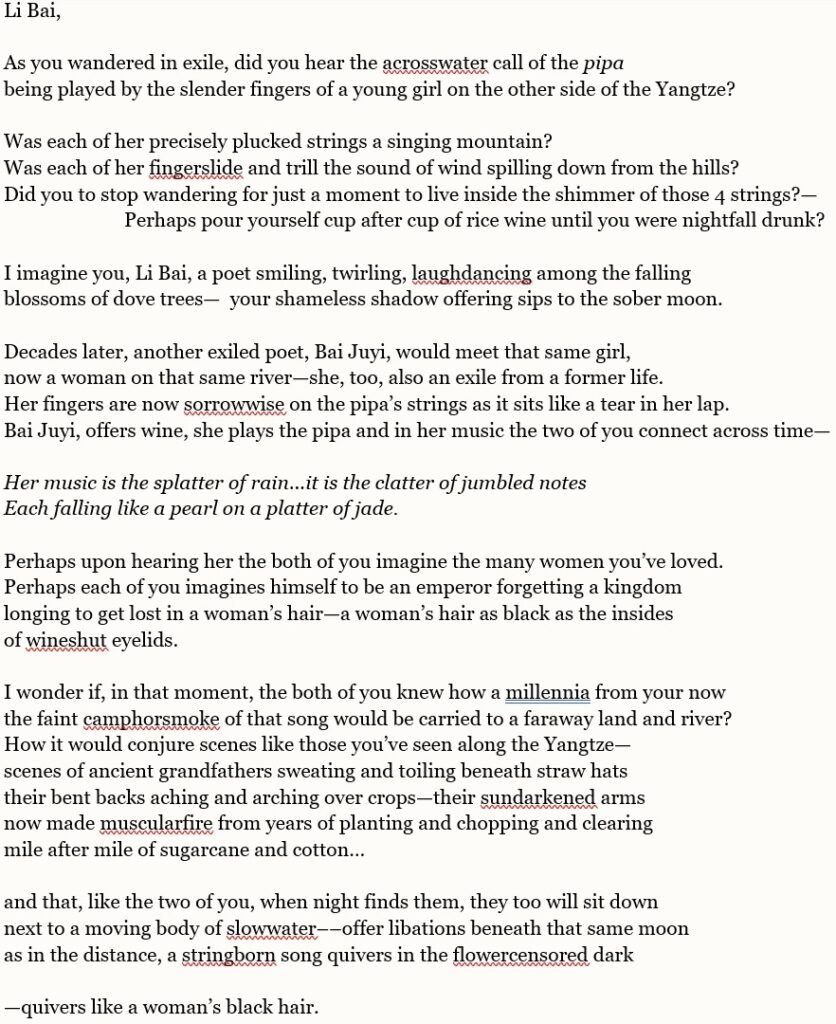 Today’s offering is the embodiment of that impulse toward artistic commonality. Some time back, Regie had the chance to work with renowned Chinese instrumentalist WuMan—she plays the pipa, an ancient lute-like stringed instrument, with the Silk Road ensemble. She later sent him a recording of a solo piece inspired by Regie’s poetry. Her enthusiasm fired up his own, and the poet composed the piece featured above. Thank goodness poetry is not hemmed in by political borders, or even the laws of time and space. Not only did Regie’s poem bridge the distance between their homes and their separate cultural backgrounds, but it opened a path back to 8th century China where its most famous poet, Li Bai (formerly known in the West as Li Po), could remind them both of the primal poetry and art-making impulse that unites them across millennia. I was even fortunate enough to see a video Regie created where poet and musician, in their separate studios, could at least seem to be performing this duet side by side. WuMan’s sometimes frenetic strums on the pipa are wonderfully echoed by Regie’s invented word-compounds and long, spirited lines. Rereading the poem, the mind can’t help but stop and linger on such marvelous phrases: the “acrosswater call” of the music; the musician’s fingers “sorrowwise on the pipa’s strings”; and, in a metaphor I think every poet will relate to, “the faint camphorsmoke of that song” rising into the sky of an attentive mind. This epistolary poem is not only directed to his literary forebears, its aim is to conjure the sort of muse that could have as easily visited Homer’s cottage as Li Bai’s—been as welcomed in WuMan’s living room as Regie’s, yours, and mine, accompanied perhaps by the scent of rice wine warming. In such consciousness, all the rivers by which civilization was created flow from one into another. At a time when the political discourse across the planet seems more determined to divide people than discover their shared purpose, the gift from artists like Regie is considerable and utterly necessary.