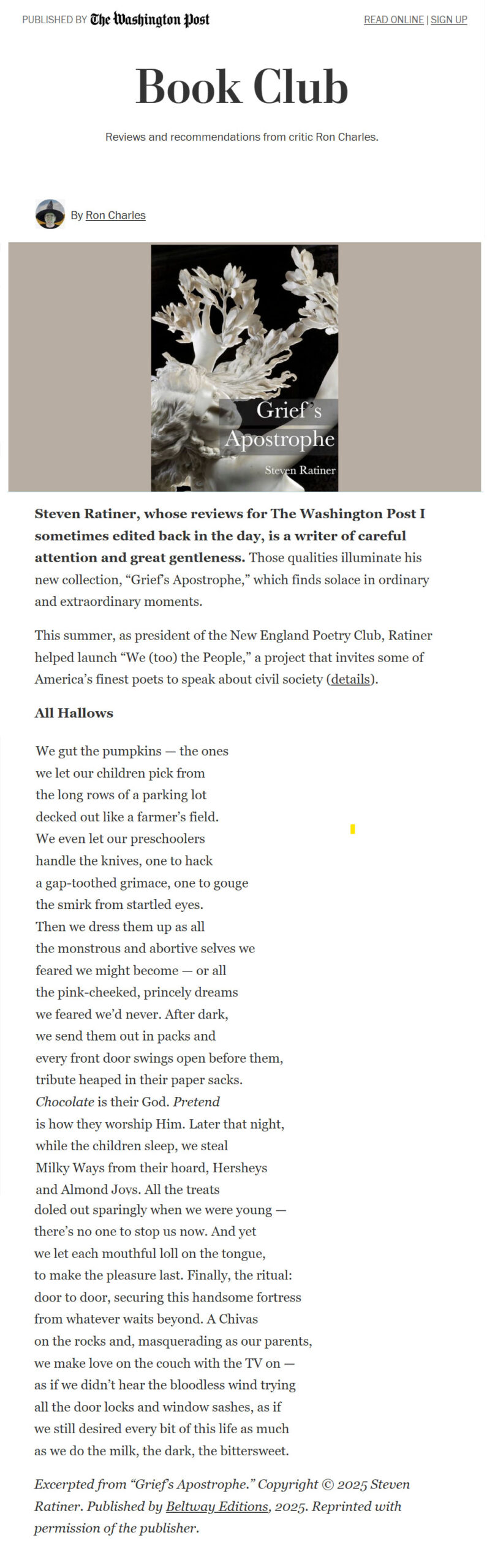 “In this heartbreakingly beautiful book, Steven Ratiner constructs a seamless fabric of grief, weaving threads of memory, keen observation of the natural world, variations on religious tradition, and an active awareness of language. Among the book’s smaller pleasures are complex metaphors, varied syntax, and constant attention to the word: the poet is “marred by, married to this compulsive / language and cannot shut it (shout it) out / even in this house of silence.” Which is fortunate for us who follow him as he moves from the personal before of witnessing illness and dementia, through a spiritually deepened and globally-expanded exploration of death itself, to an after that finds solace in “love’s continuance, grief’s/temporary reprieve,” as well as the more permanent gift of art. Steven Ratiner has been championing other poets for many years. This gorgeous collection of his own fine work is long overdue.”